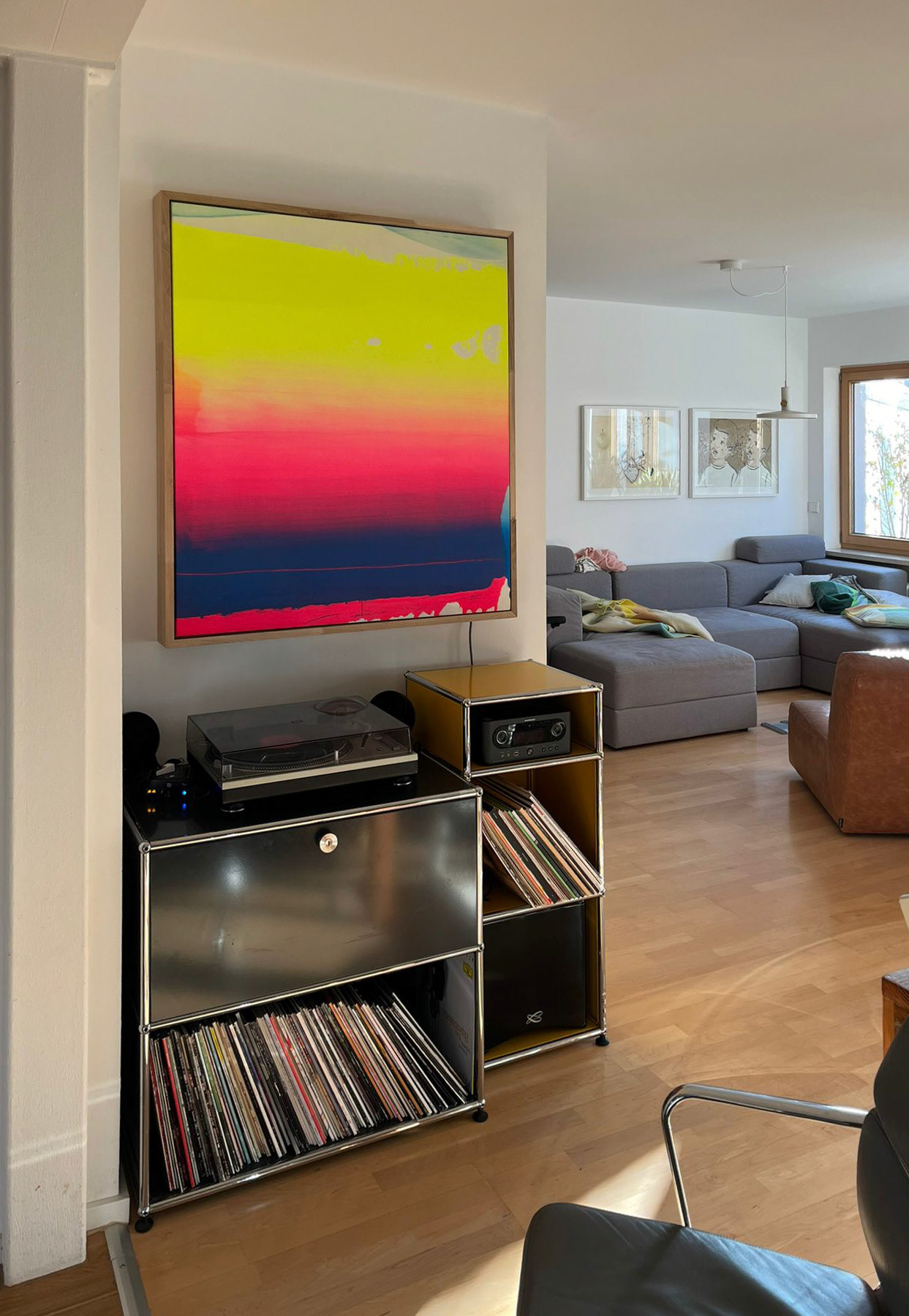 Die wechselnde digitale Lichtebene verstärkt diesen Eindruck, indem sie die Farben subtil verändert und dem Bild eine ständige Bewegung verleiht. #3 ist ein Kunstwerk, das sich nicht nur dem Raum anpasst, sondern ihn auch neu definiert – ein Zusammenspiel aus Licht, Farbe und Emotion, das immer wieder neue Facetten offenbart.